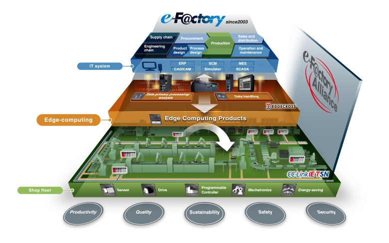 Our e-F@ctory concept utilizes cutting-edge control and networking technologies to “visualize” information and coordinate with high-level manufacturing execution systems to improve production. This allows production facilities to increase uptime, shorten lead times, improve quality, cut costs and otherwise optimize operations. The e-F@ctory reduces total cost of ownership (TCO) by cutting total costs in development, production and maintenance, and optimizes operations by integrating advanced technologies. It also improves production floor coordination with its iQ platform-compatible engineering environment, controllers, HMIs and networks.