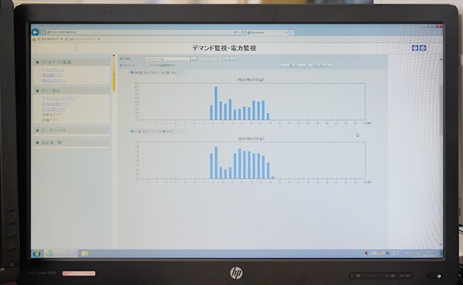 This screen for monitoring the real-time electricity demand helps to efficiently control power consumption in the factory to avoid exceeding the contract demand level.
