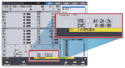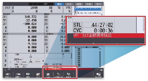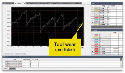 NC MachiningAID automatically identifies the feature associated with tool wear from the features of each axis and the correlation between the tool usage, then automatically learns the tool life on a process-by-process basis. Once trained, the NC MachiningAID predicts the tool deterioration (erosive wear) on a machining-by-machining basis, and when the tool is nearing the end of its life, it indicates a corresponding CNC alarm message to organize the user to change the tool.