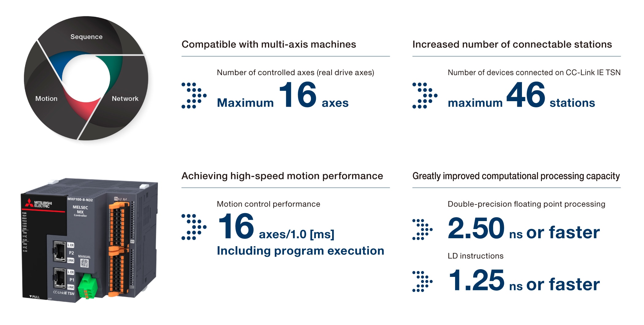 The MELSEC MX Controller integrates three types of control, sequence, motion, and network.