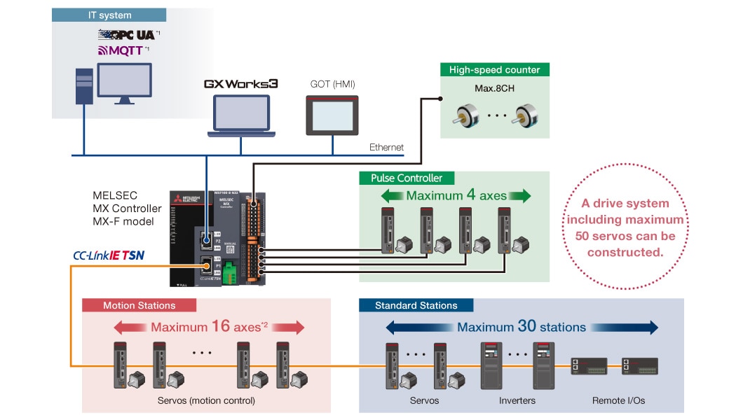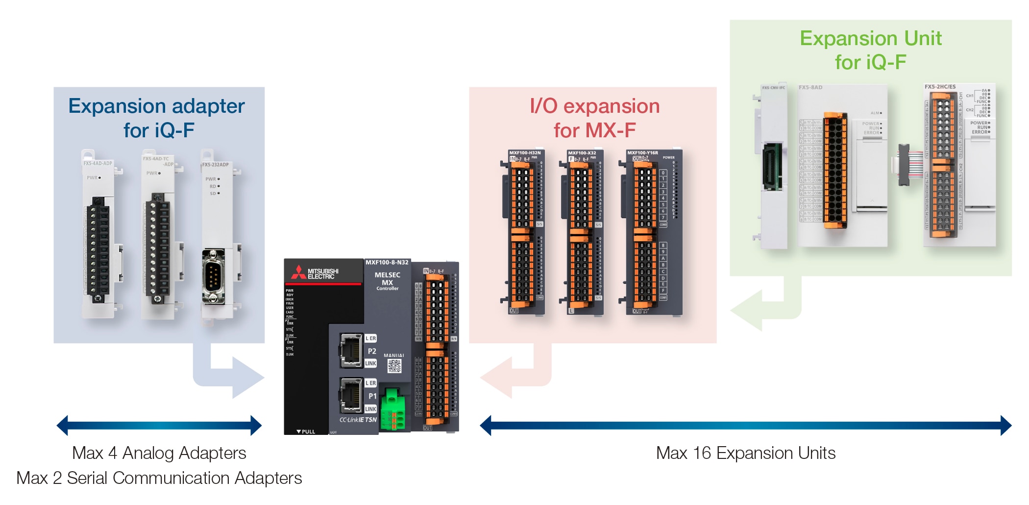 A diversified and sophisticated system can be constructed by using the MX-F models with the MELSEC iQ-F Series modules.