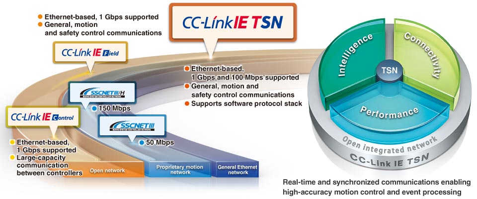 CC-Link IE TSN is an open industrial network inheriting the easy diagnostics of the CC-Link IE Field Network, the large-capacity data communications of the CC-Link IE Control Network, and the high-performance motion control features of SSCNET. Through the incorporation of TSN technology, this network further leverages control system performance to realize an open integrated network with advanced functionality.