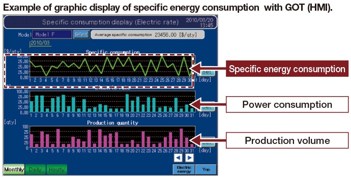 - Allows for easy graphic display of specific energy consumption with a GOT (HMI) installed on the control panel at the manufacturing site.