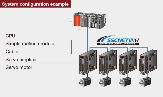 The SSCNETⅢ/H connection reduces wiring, enables connections of up to 100 m between stations, and easily supports absolute position settings. The upper limit LS, lower limit LS, and near-point dog signals can be input from the servo amplifier, thus greatly reducing wiring. In addition to positioning control and speed control, processes such as synchronous control and electronic cam control can be performed.
