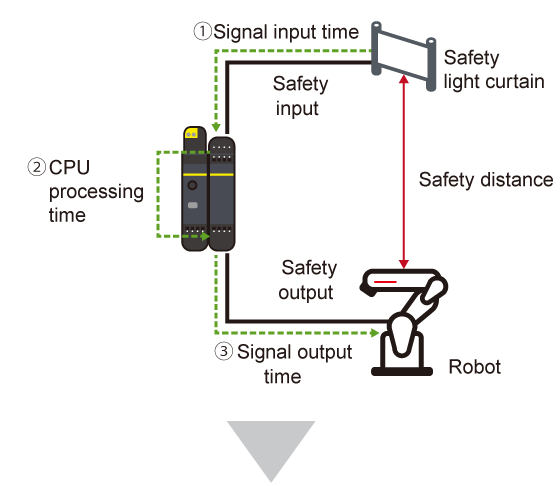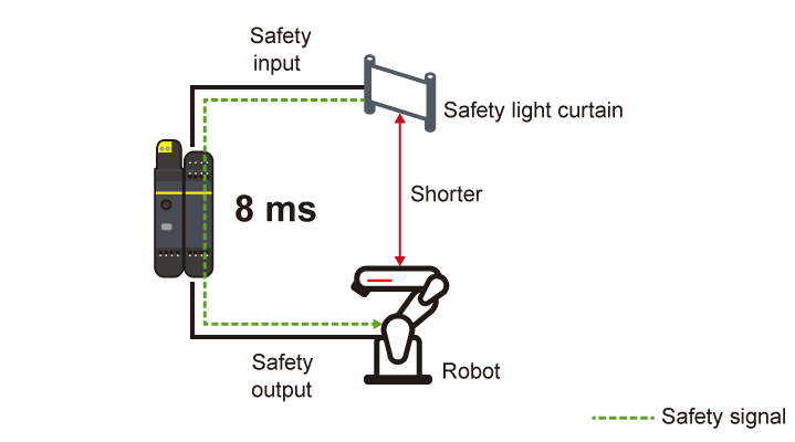 The fast shut off function that enables the safety I/O module to shut off safety output without going through the CPU module realizes a response time of 8 ms. Since similar response time is achieved even with increased I/O points, the safety distance can be shortened even in the large-scale safety system.