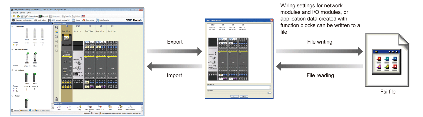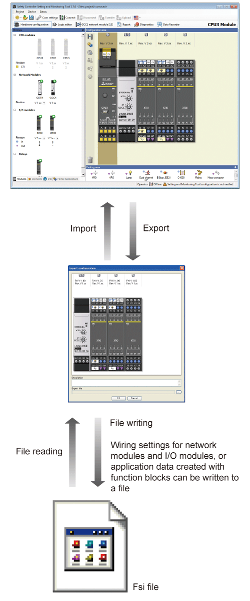 The connection settings to the I/O modules or application logic created with function blocks can be stored in a single setting file, and data can be read out of stored setting files.