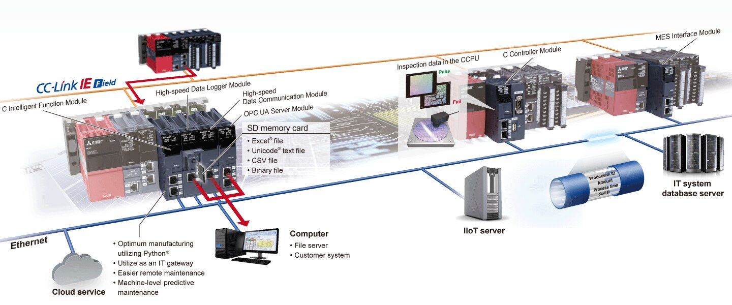 The MES interface module realizes direct access to the IT system with easy setting. Overall system cost is reduced as the simple configuration does not require gateway computers. The C intelligent function module supports Debian GNU/Linux that realizes connectivity with third-party cloud services. Predictive and remote maintenance of machines are easily realized. The OPC UA server module supports secure and open communication protocols, seamlessly connects the IT system and the shop floor.