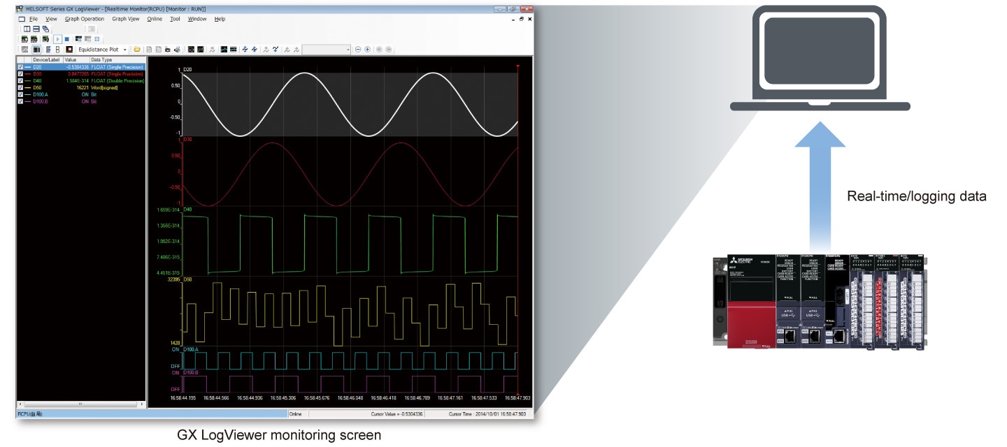 - Utilizing the installed SD memory card, CPU internal memory or a direct live connection to the CPU module, logging data (device/label) can be easily collected just by simply registering the parameters. In addition, monitoring via USB or Ethernet in real-time is possible
