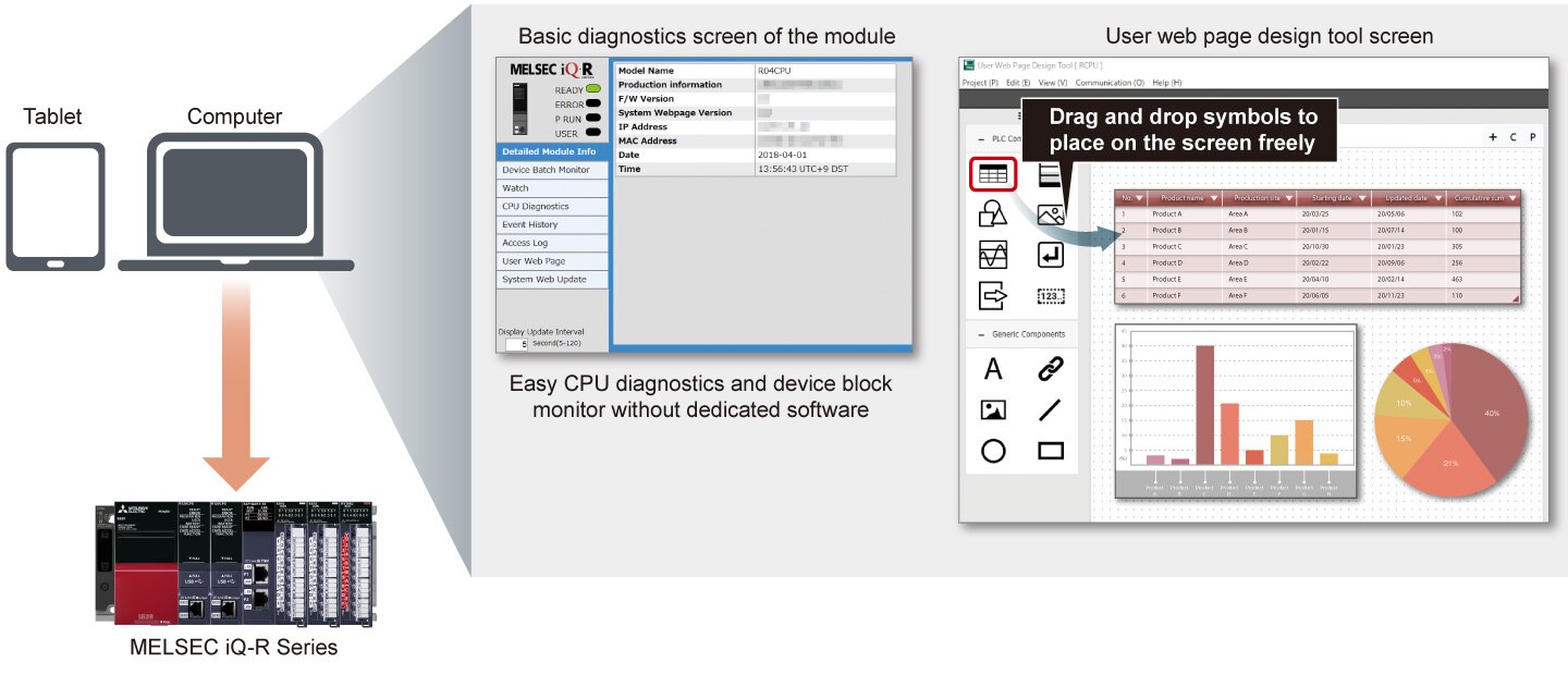 - The Web server function built into the CPU enables easy access to CPU diagnostics and device batch monitor via a PC or tablet web browser without the need to create graphics