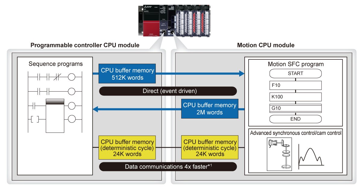 - In the multiple CPU configuration with the programmable controller CPU module and motion CPU module, a large memory area shared for high-speed data communication is provided