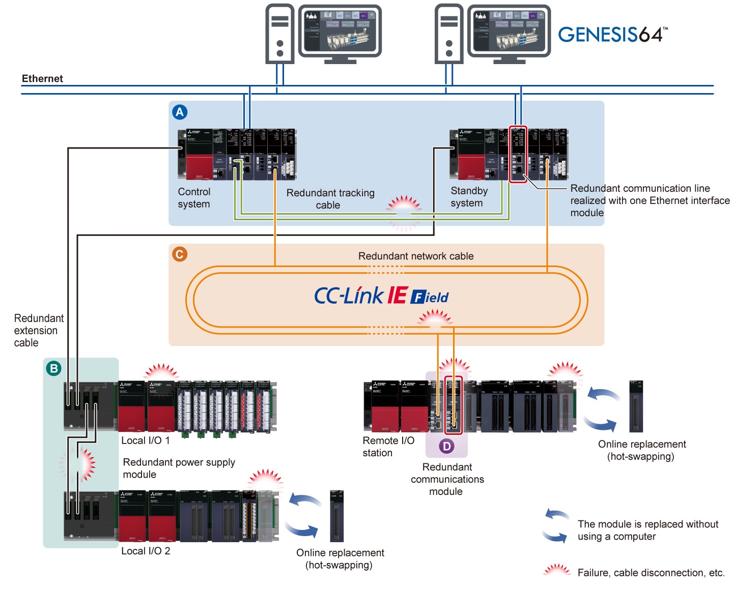 - Online replacement of cables and modules (hot-swapping) is possible while continuously operating the system when an error occurs, enabling prompt troubleshooting