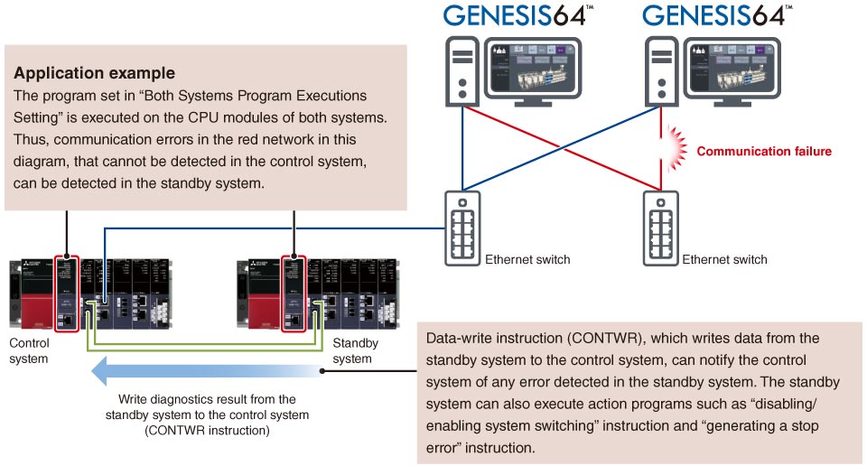 - An error in an external device or network of the systems (control system and standby system) can be detected by executing a program that diagnoses external devices or networks of both redundant systems.