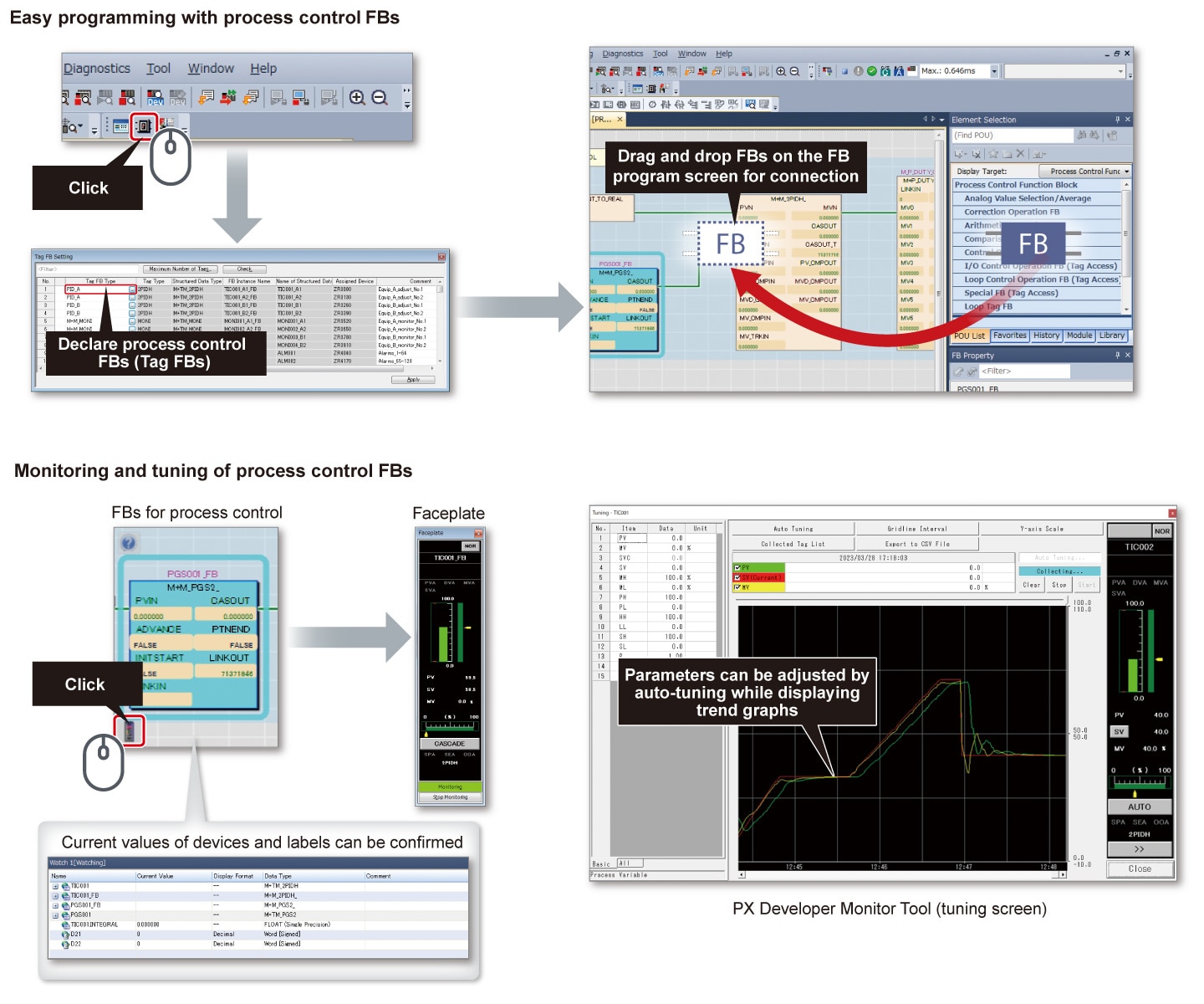 - Tag FBs for process control enable monitoring on the faceplate, trend display on the PX Developer monitoring tool, and parameter setting utilizing auto-tuning, thus making adjustment of the system startup easier