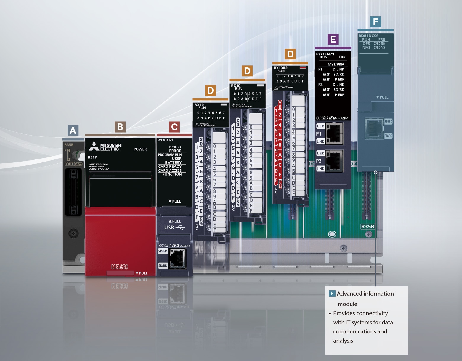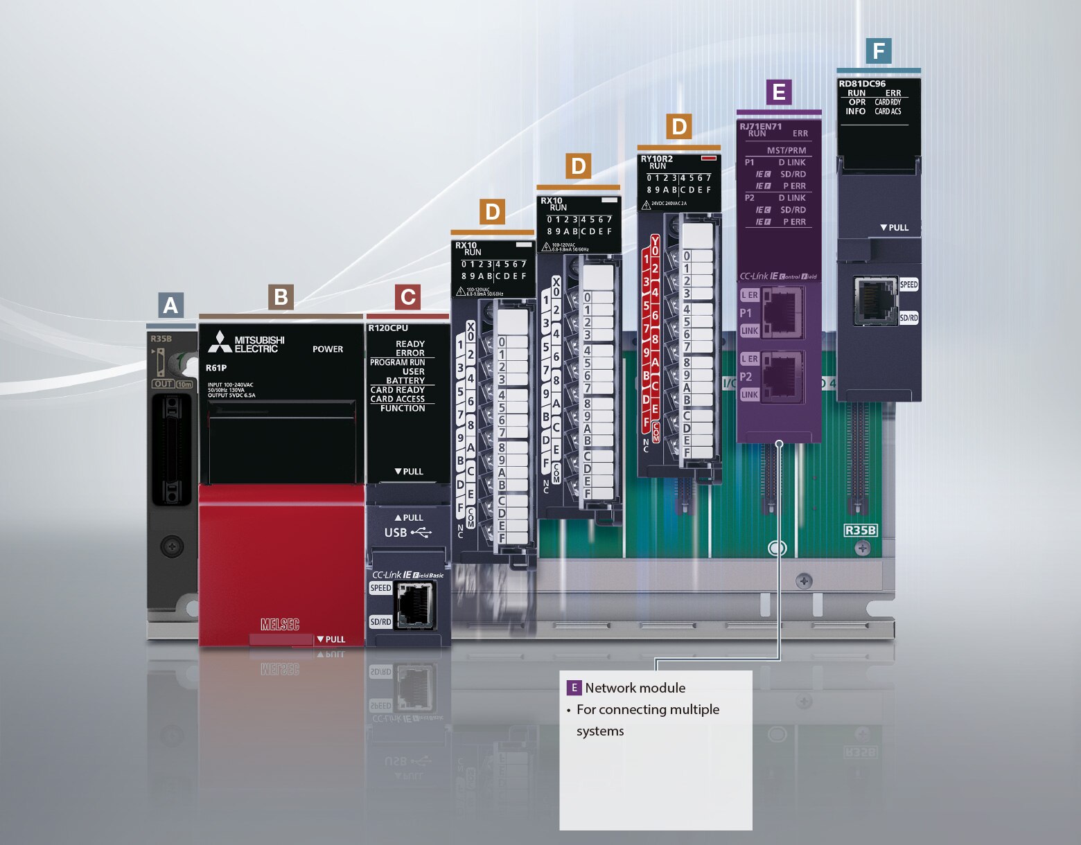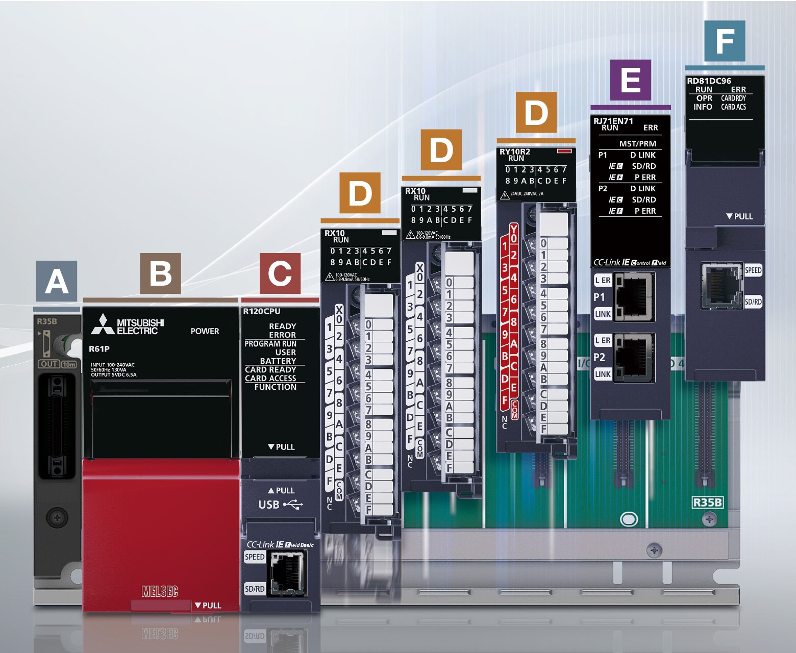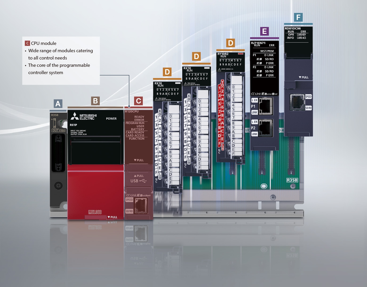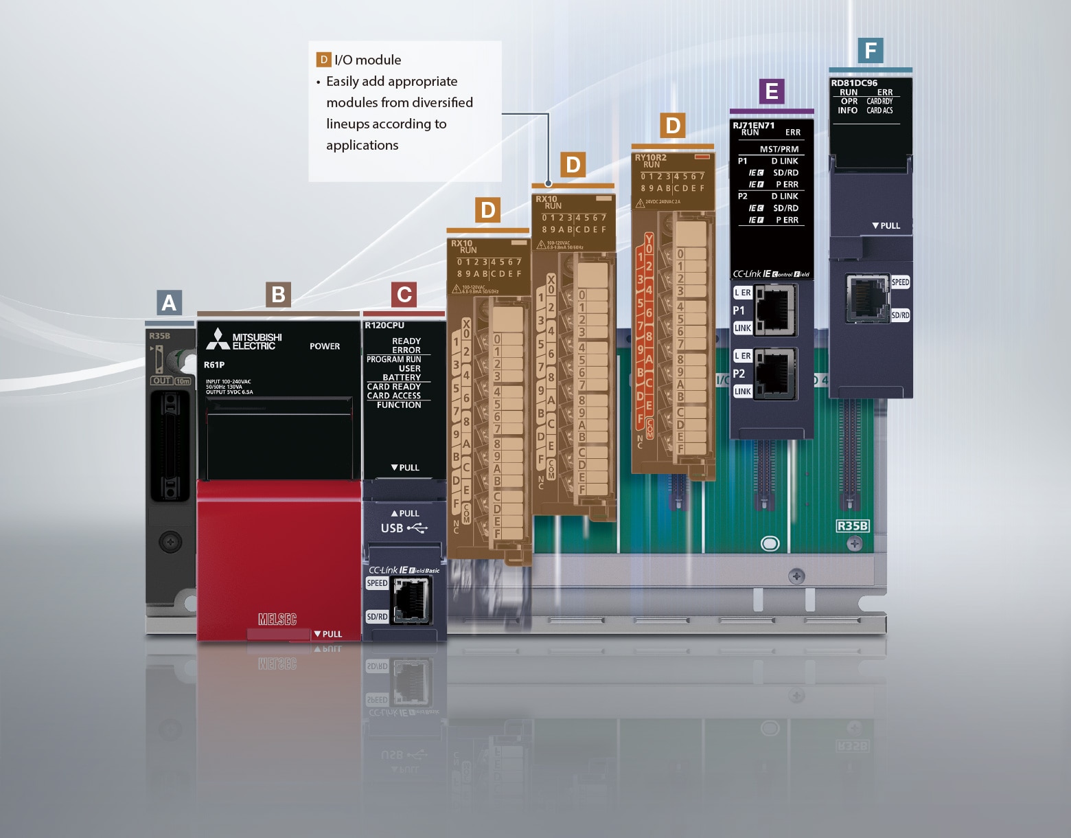 The MELSEC iQ-R Series is a modular control system equipped with various modules, each having its own responsibility in a system, enabling selection of appropriate modules according to the application.