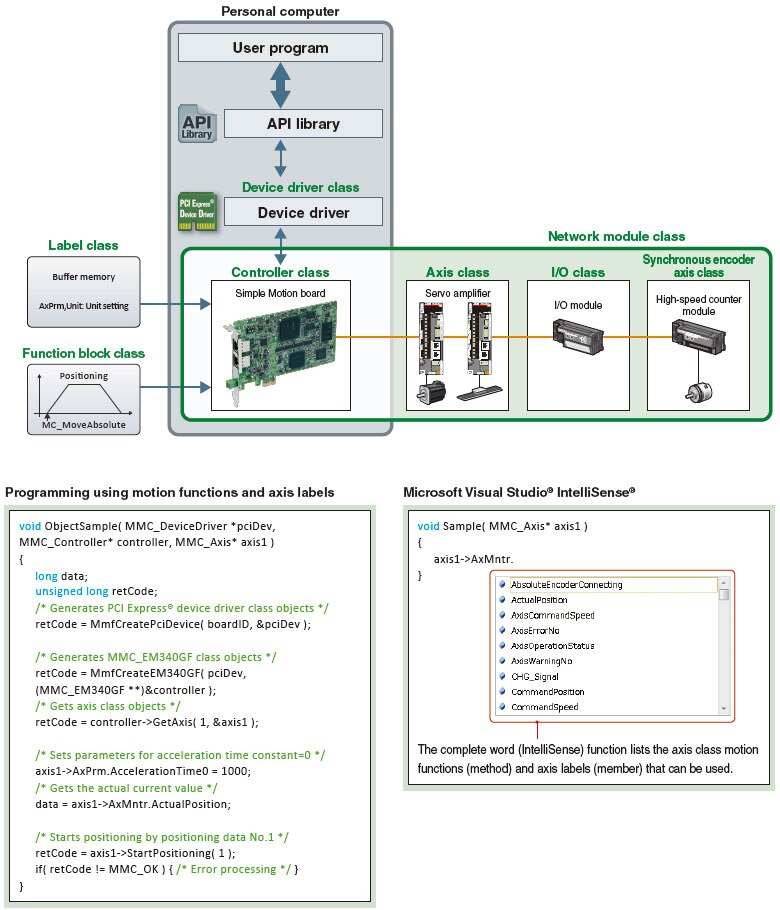 The API library is an add-on library which uses functions (method) and labels (member) of controller and axis classes, and enables easy programming with Visual C++®.