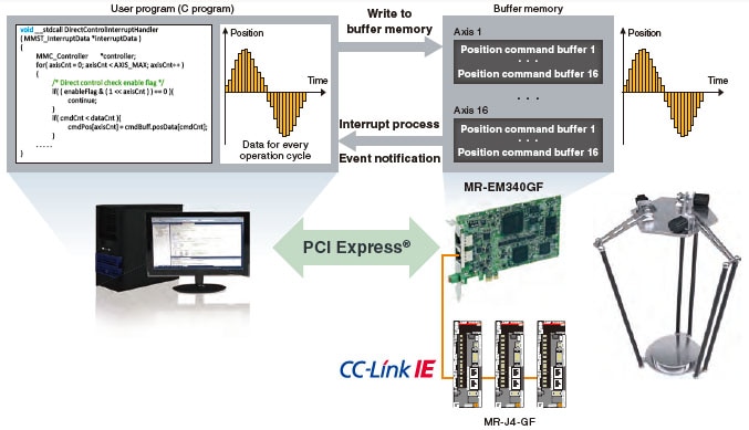 Numerous motion control functions, such as positioning, synchronous control, and speed-torque control are performed by the Simple Motion board being embedded in a PC which supports PCI Express®.