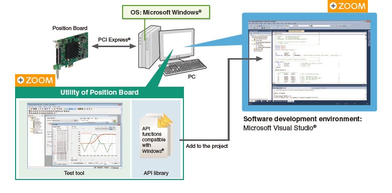 Create a user program by adding the API library for positioning control to the project of Microsoft Visual Studio® which runs on a Windows® OS PC.