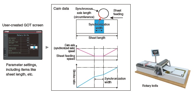 An ideal cam data can be created just by registering sheet length, synchronous width, and cam resolution to the specified device memory on GOT screen.