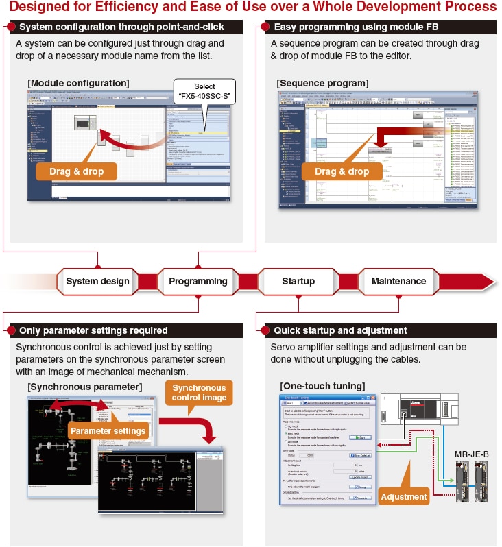 The advanced synchronous control is software-based synchronous control as an alternative to mechanical control, such as gear, shaft, clutch, speed change gear and cam. In addition, cam control becomes even easier with cam auto-generation function.