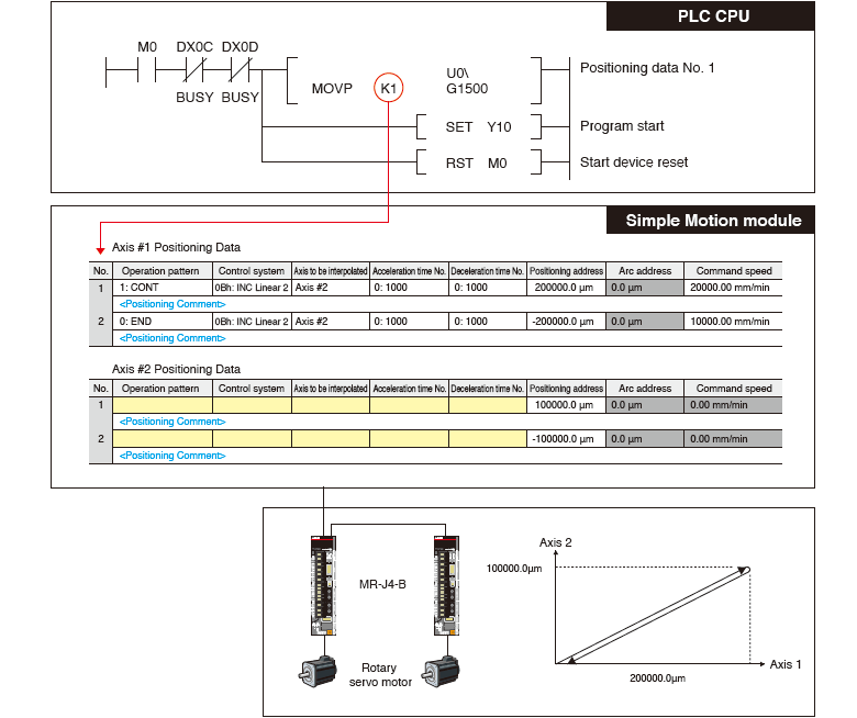 - Automatic operation can be executed easily by setting positioning addresses, speeds, and other setting items in a sequence program.