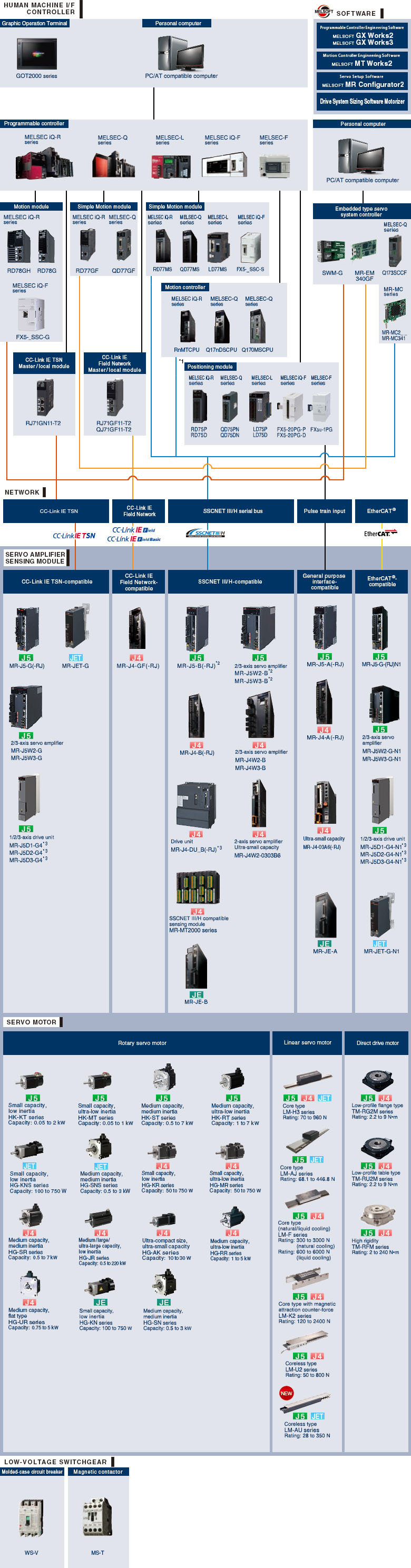 A wide range of products includes: MELSERVO-J5 series supporting the new network, CC-Link IE TSN; MELSERVO-J4 series supporting SSCNET III/H; and the one-touch servo, MELSERVO-JN series.