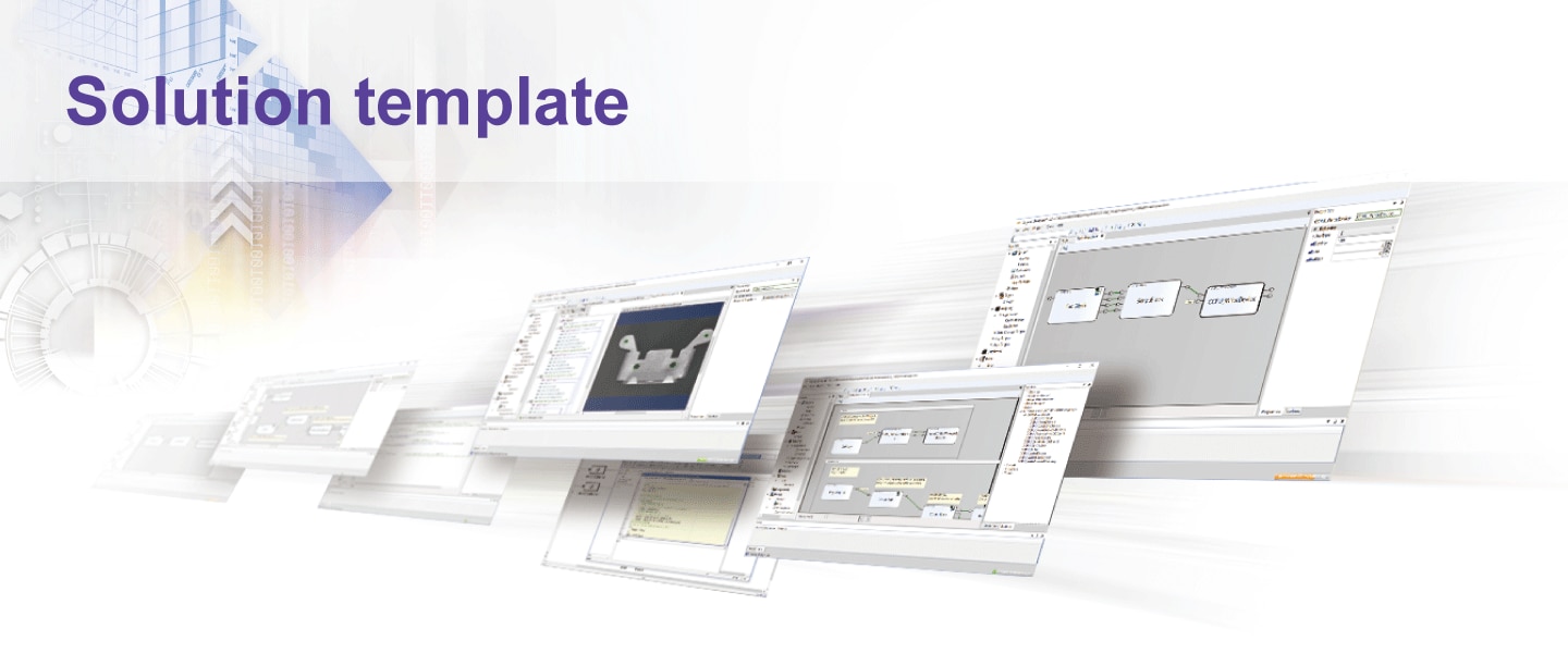 Solution templates are sample programs designed with customer's applications in mind such as inspection by image processing and monitoring/control by model-based development. Multiple solution templates are available for selection according to the application. Using the template as a system development base enables MELIPC application development easier.