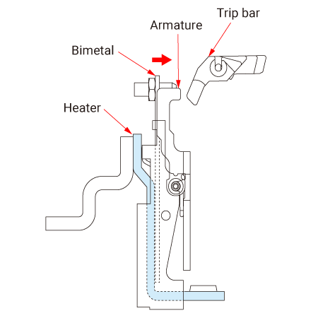 - Time-delay tripping operationWhen overcurrent flows, the bimetal becomes overheated, bending in the direction shown by the arrow and moving the trip bar.