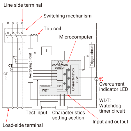 - When overcurrent or large current flows, the timing circuits operate according to the maximum current, and the trigger circuit outputs the trigger signal. This excites the trip coil and activates the open/close mechanism.