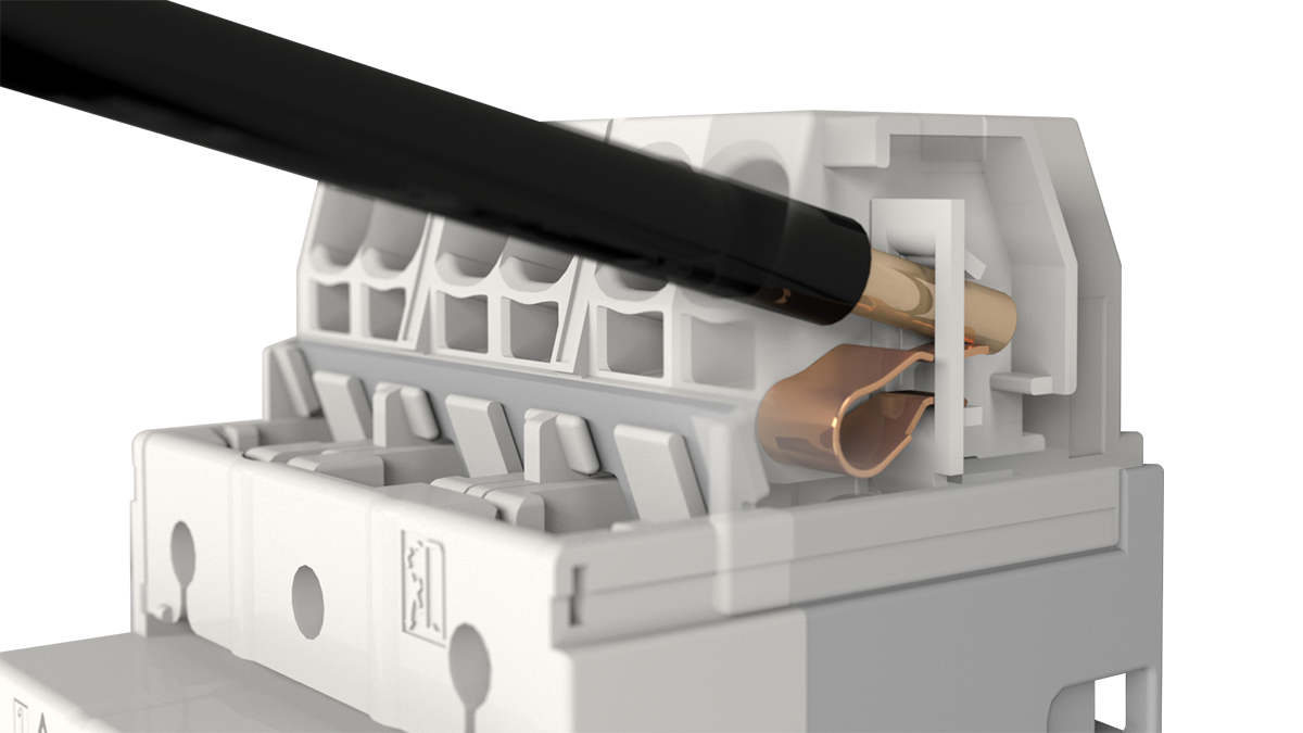 Spring clamp terminals stay connected using spring pressure to press a wire directly against the conductive section. Single wire and ferrule terminals can be connected simply by plugging them in. Even stranded wires can be connected simply by opening the spring with a tool, inserting the wire, and removing the tool.