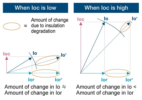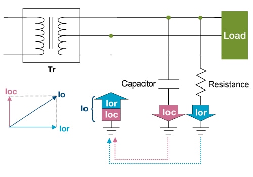 Ioc is higher in equipment with long wiring distances or with inverter devices or various filters installed, so detecting insulation degradation (due to small changes in Io) becomes difficult and Ior measurement is more effective.