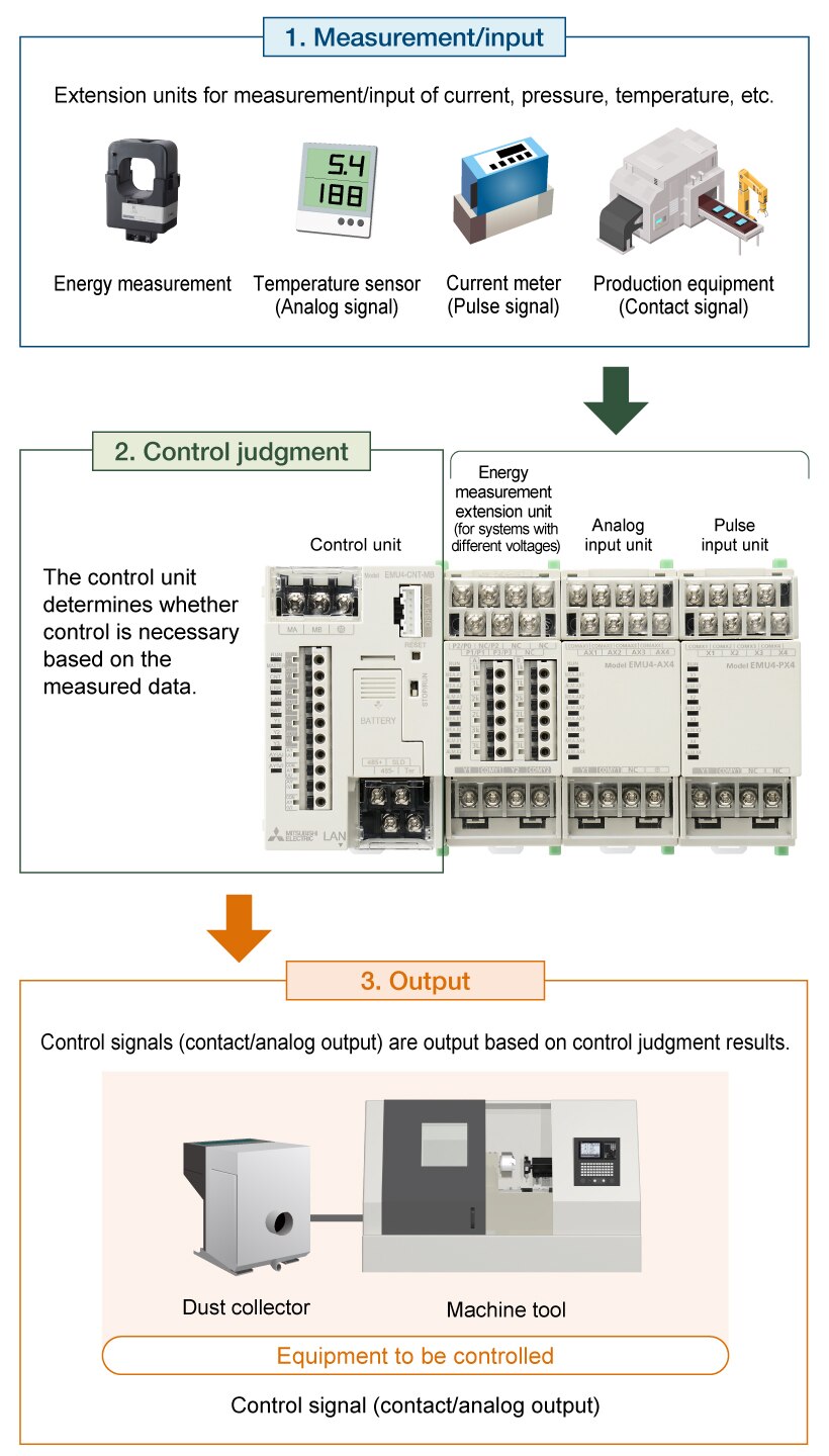 Using units equipped with a function to turn equipment on or off according to measured values makes it possible to improve the energy savings of ancillary utility and production equipment in factories. Control units can be easily configured from a PC using the dedicated engineering tool.