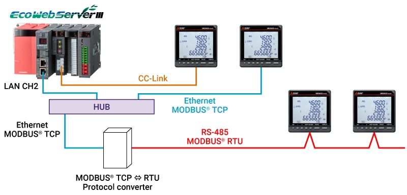ME96SS has MODBUS® RTU (RS-485) communication function as standard. Also there are available optional modules usable CC-Link communication and MODBUS® TCP communication in an Ethernet network.