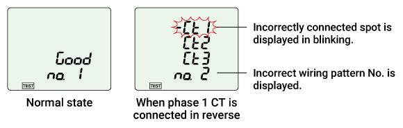 Whether the voltage/current input wirings are correct or not is displayed. As for the incorrect wiring display pattern, see the instruction manual.