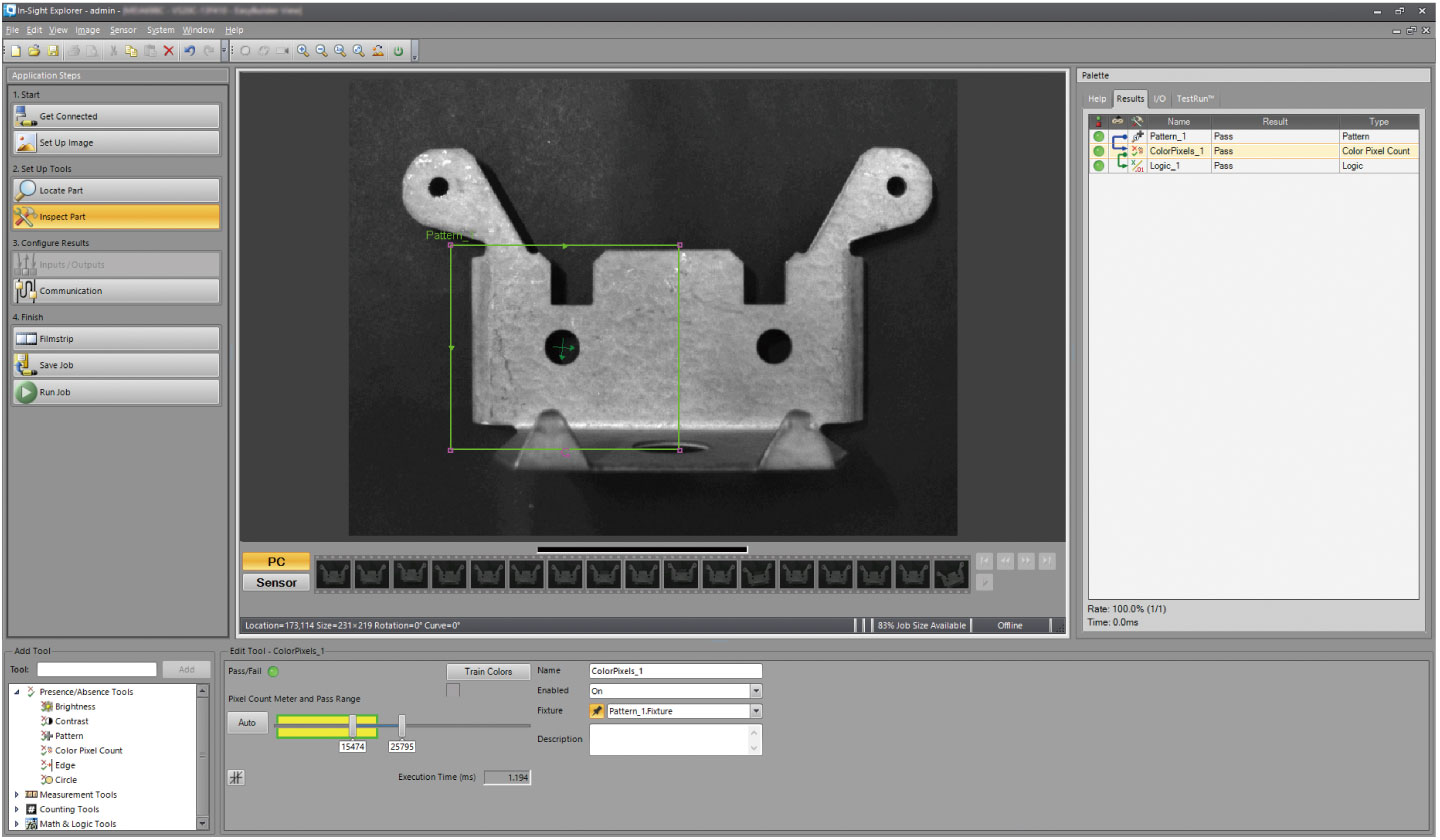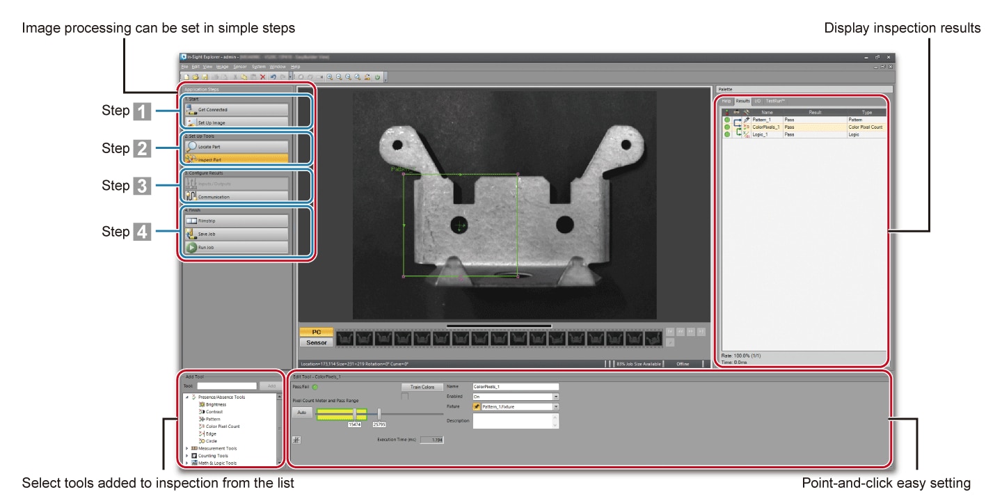 The ease-of-use In-Sight Explorer enables configuration from image acquisition to result output in four steps. Both novice and experienced users can handle the tool easily.