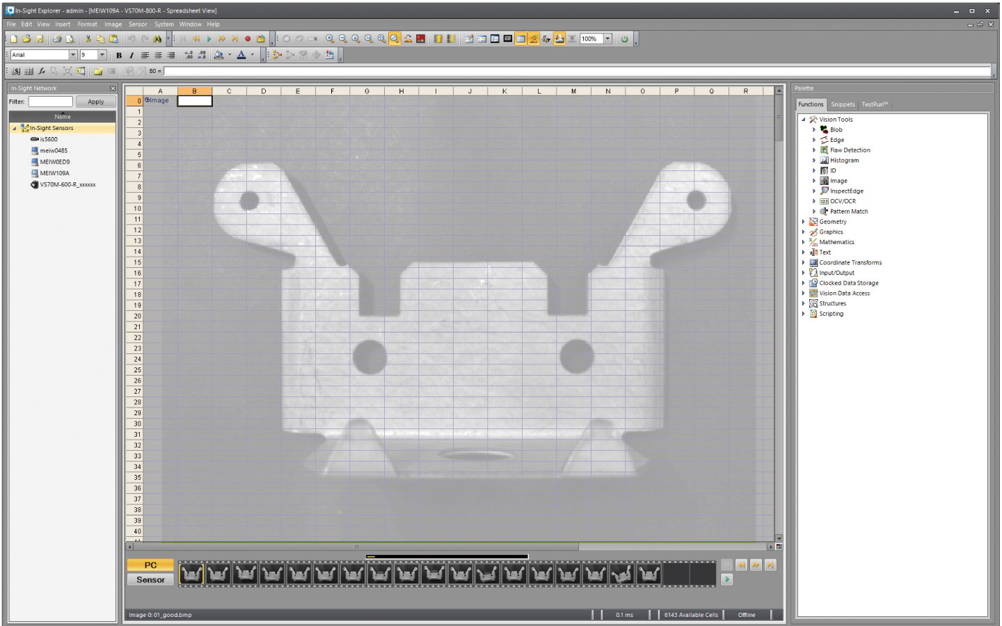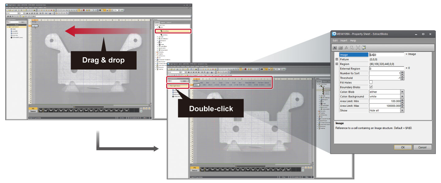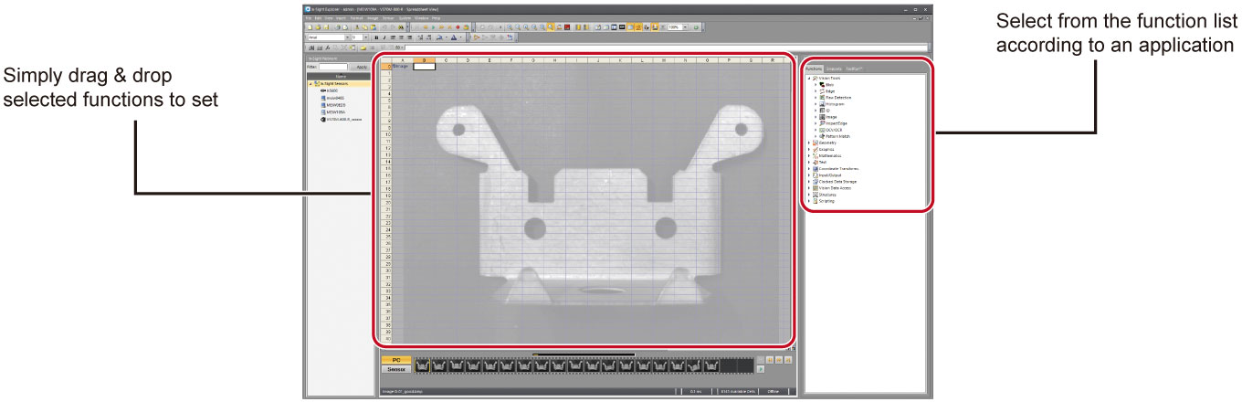 Spreadsheet is a development environment suitable for creating a complex vision application. Vision sensor functions can be maximized with this spreadsheet. By flexibly arranging functions on the spreadsheet, applications can be created.