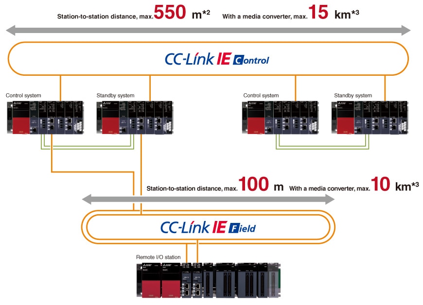 By using a media converter, the station-to-station distance on the CC-Link IE Controller Network can be extended up to 15 km and the station-to-station distance on the CC-Link IE Field Network can be extended up to 10 km, allowing distributed configuration of systems.
