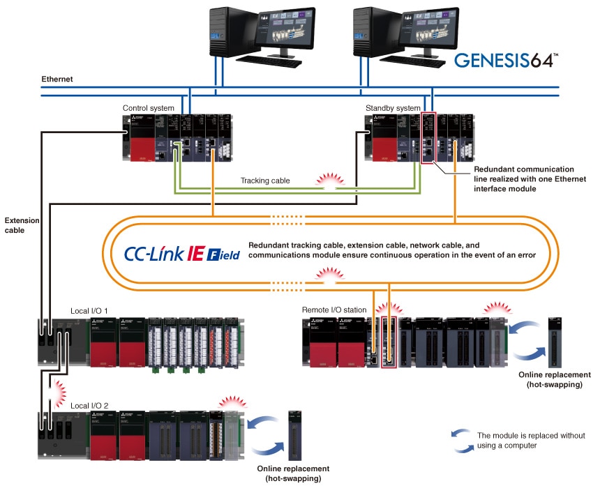 A multi-level redundant system can be realized by installing dual control systems consisting of the control (primary) and standby CPUs. Combined with a dual extension cable topology for both the redundant extension base units and network cabling of the CC-Link IE Field Networks together with dual remote stations, the risk of singe-point failure can be minimized. Online replacement of cables and modules (hot-swapping) is possible while continuously operating the system when an error occurs, enabling prompt troubleshooting.