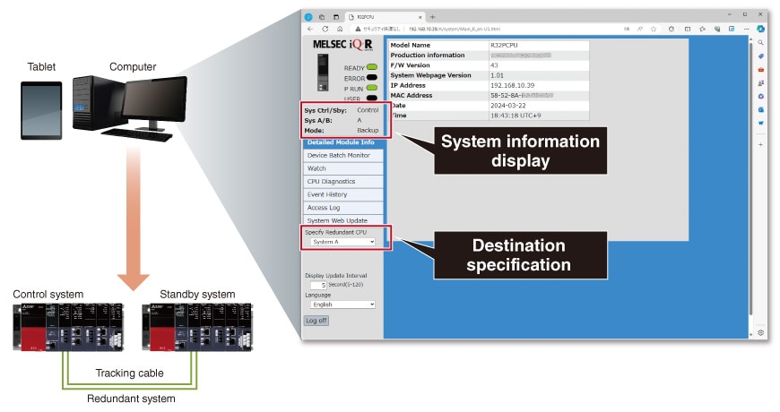 - CPU diagnostics and device monitoring*13 can be done via a web browser on a computer or tablet utilizing the CPU internal web server function without the need for screen creation by the customer