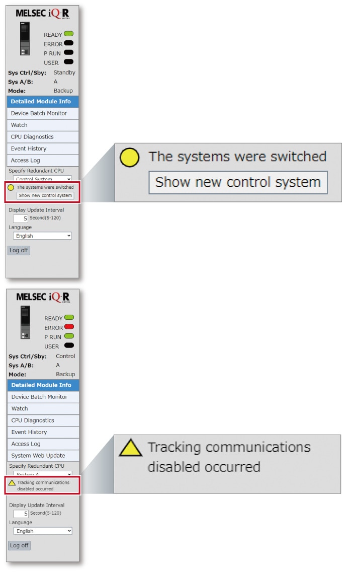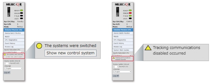 - The system status can be checked at a glance by displaying a message when tracking communications are disabled or systems are switched