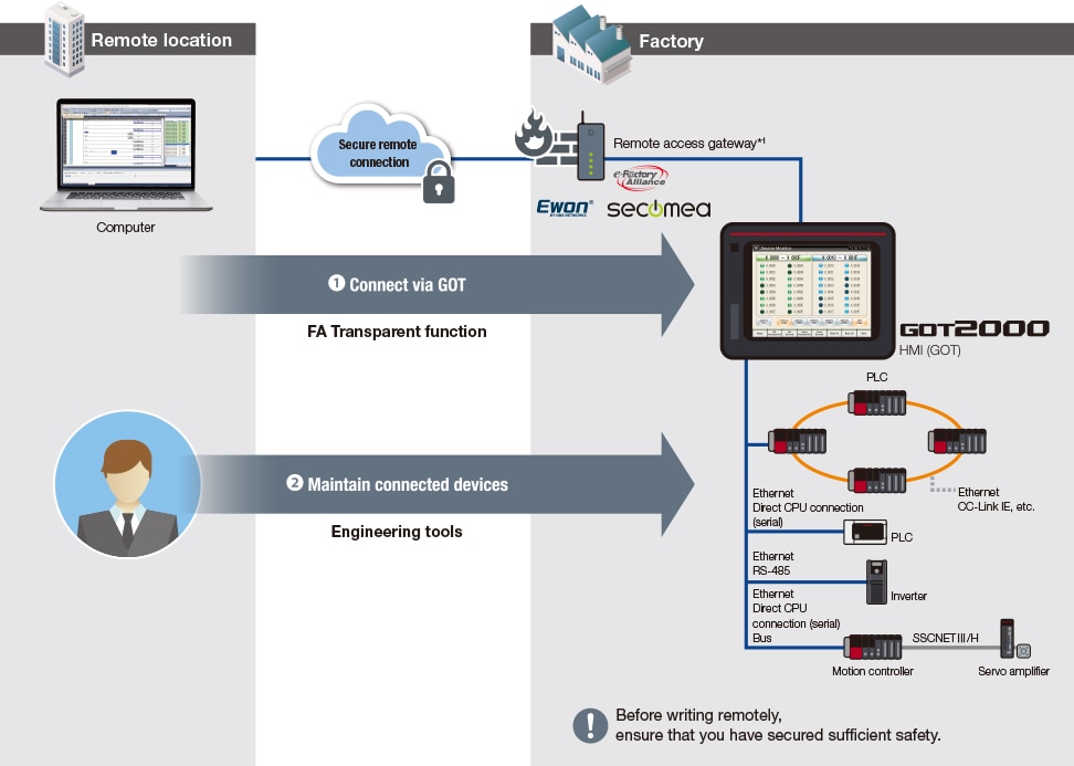 - By linking GOT with individual FA devices, users can review information and perform maintenance using GOT even from remote locations.