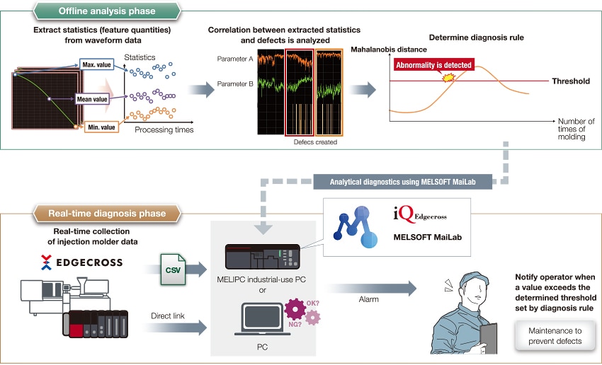 Using the data collected with MELIPC industrial-use PC in the MELSOFT MaiLab (data analysis software), feature quantities from parameter waveform data that may affect molding quality are selected, the association with defects is analyzed, and diagnostic rules are created. By collecting molding machine data in real time with MELIPC and diagnosing it based on rules using MELSOFT MaiLab, signs of molding defects are identified and maintenance can be performed before multiple defects occur.