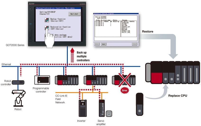 By performing backups in advance, it is possible to restore FA devices from GOT on-site without a PC in the event of an FA device failure, which reduces downtime.