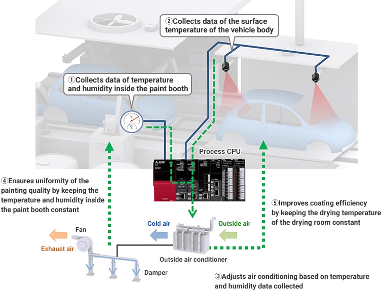 | Ensuring uniformity of the painting quality by controlling the temperature and humidity, and adjusting the air intake/exhaust balance of the paint booth | Control temperature (using PID control) and air conditioning to ensure uniformity of the painting quality. |