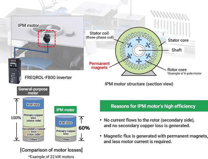 - The IPM motor with a built-in permanent magnet has less motor loss than a general-purpose motor.