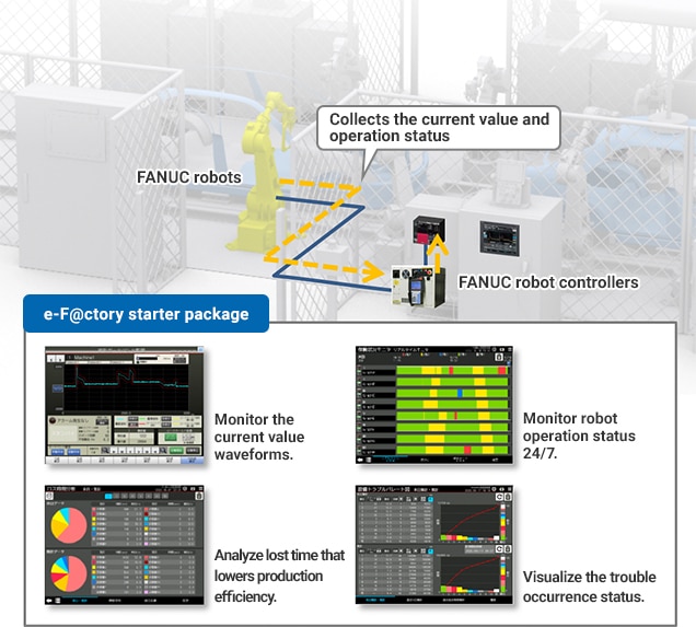 - Connect a robot controller to an Ethernet module, collect data required to monitor the operation status (axis current values and errors, operation status) from the controller, and utilize the collected data with e-F@ctory starter package.