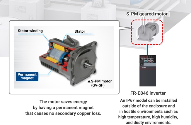 Save energy by using a high-performance, energy-saving S-PM geared motor to control a belt conveyor. Save costs by using an IP 67 model of inverters that can be installed in various environments, including outside of an enclosure.
