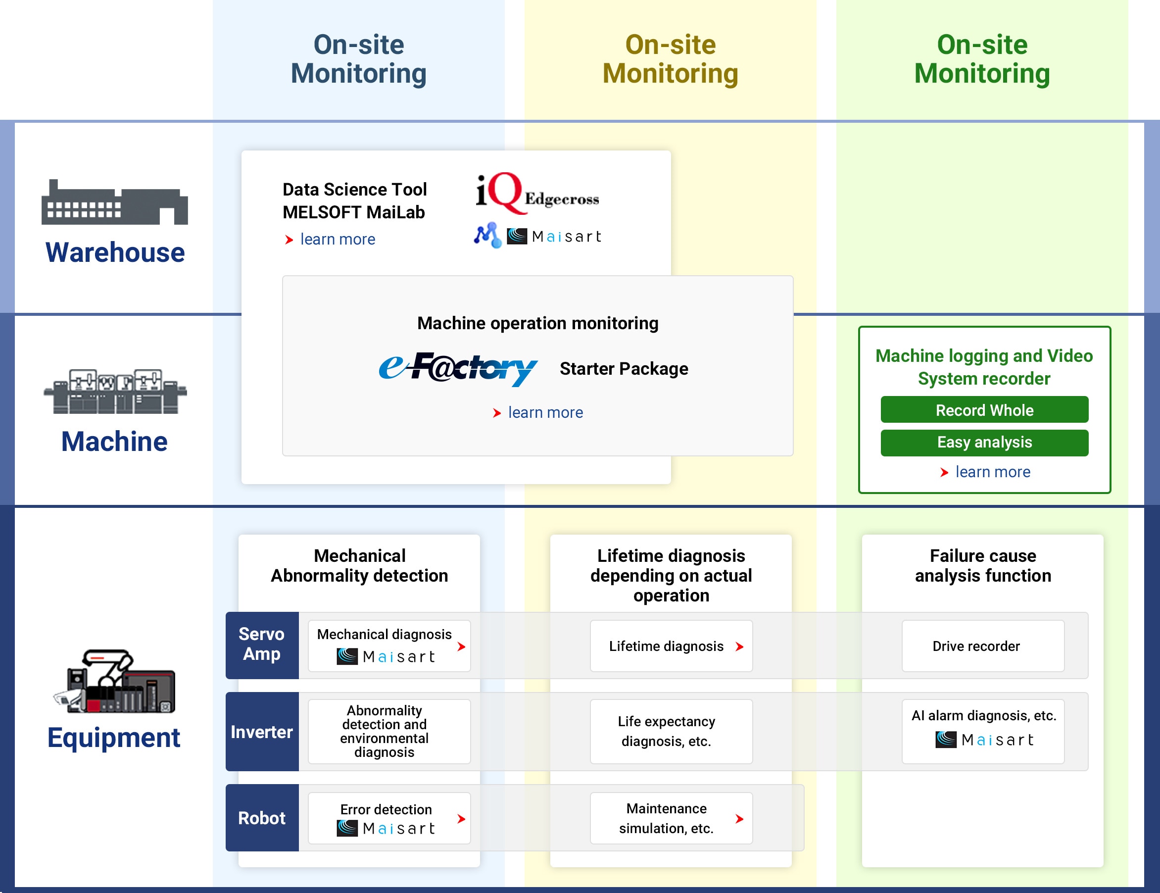 ❶ With AI and edge computing technology Predictive and preventive maintenance at the warehouse/machine/equipment level ❷ With a system recorder and general-purpose camera corrective maintenance solution |