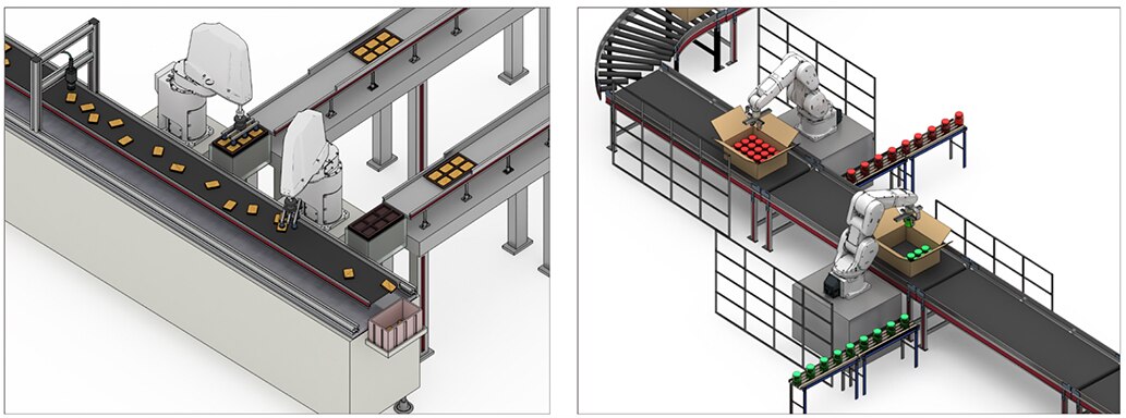 | Automation of lines with large transport volumes, simple transport and boxing tasks | High-speed vision picking system. Automation with industrial robots including peripheral sensor equipment |